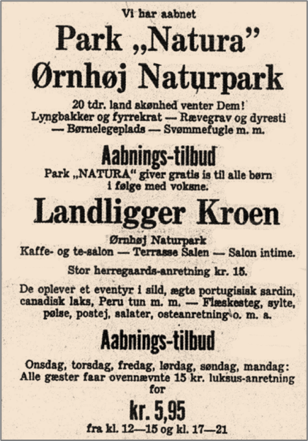 2 km vest for Ørnhøj midt på de store lyng- og hedearealer åbnedes i går middag ”landliggerkroen” og ”Park Natura”. ”Park Natura” er et 20 tdl. land stort hedeareal med lyngbakker, fyrrekrat, rævegrave, dyrestier og desuden en legeplads for børn, et bassin med svømmefugle osv.