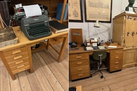 Det vi ser her er en lille del af administrationskontoret på Herning Sygehus. Der er en gammel skrivemaskine og regnemaskine, skrivebord og skrivebordsstol. Endelig er der det gamle pengeskab. Det minder meget om det pengeskab med navnet Frank Jæger, der var med i Olsen Bande filmene.